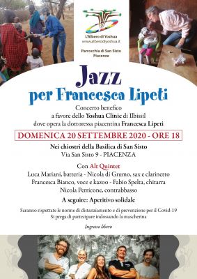 Domenica 20 Settembre alle ore 18.00, in collaborazione con la Parrocchia di San Sisto e l'associazione L'Albero di Yoshua ODV, nei chiostri della Basilica di S. Sisto si è tenuto il concerto benefico dell' Alt Quintet in favore dello Yoshua Clinic dove opera la dottoressa piacentina Francesca Lipeti.