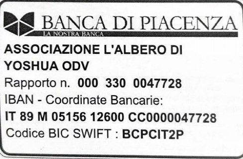L'Albero di Yoshua ha un nuovo IBAN! Il vecchio è ancora attivo per qualche mese ma vi invitiamo a prendere nota del cambiamento.